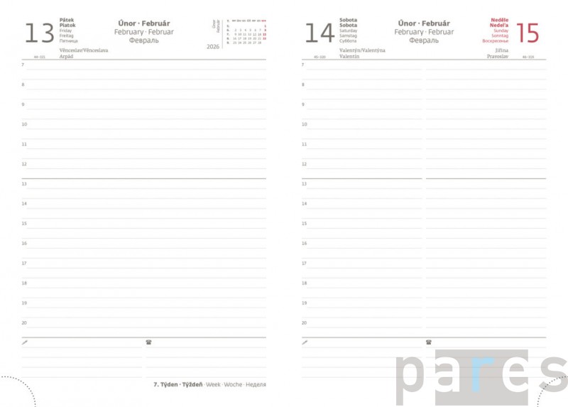 Formát diáře: 145 x 205 mm Rozsah diáře: 352 stran Kalendárium: denní + poutko na propisku + možnost dokoupit si náhradní náplň
